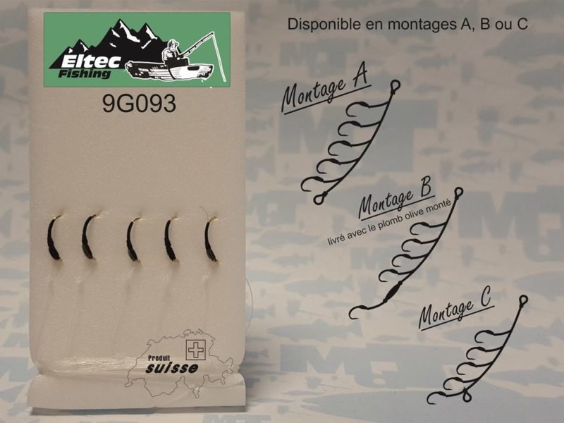 Gambe originale suisse pour le corégone, l’omble et la perche à 5 nymphes, en taille d’hameçons no12 dorés. Taille du fil de montage 022, longueur de la gambe 215cm. Taille de fil de potence 022. Longueur des potences, 3cm. Types de montages A, B ou C. Fabrication et qualité suisse par Eltec Fishing.